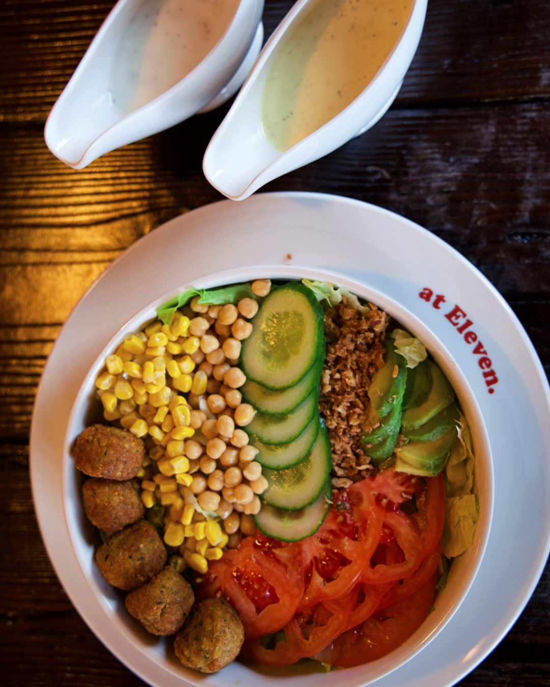 Knackiger Salat, Falafel, Avocado, Tomaten, Gurken, Röstzwiebeln, Kichererbsen, Mais