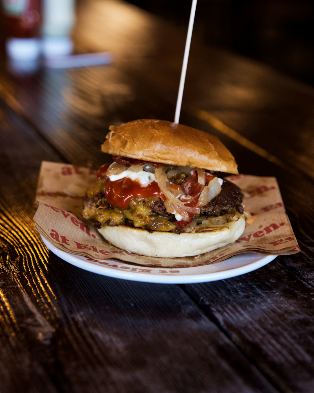 Beef, Irish Cheddar, Röstzwiebel, Tomate, Bacon, Salat, BBQ & Eleven Sauce